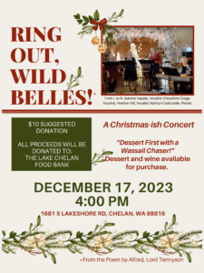 Karma Vineyards Events & Calendar « All Events This event has passed. Ring Out, Wild Belles Fundraiser! December 17, 2023 @ 4:00 pm - 6:00 pm « Open for Tasting Closed » Please join us for a Christmas-ish Concert on December 17th at 4pm with our very own Jeannie Evig Kapple! Add to calendar Google Calendar iCalendar Outlook 365 Outlook Live Details Date: December 17, 2023 Time: 4:00 pm - 6:00 pm